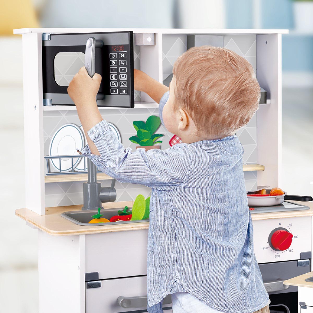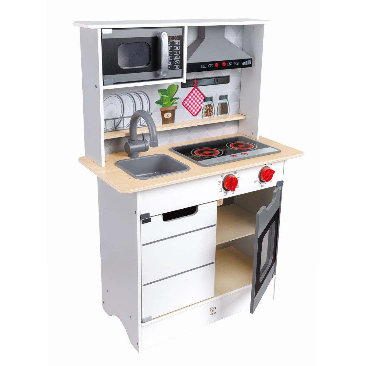 Juego de cocina completa con efectos de luz y sonido, incluyendo un hornallas, extractor de aire, horno con botones giratorios y canilla. Incluye sartén y espátula de metal, microondas y armario. Fomenta la imaginación y el juego creativo de los chicos.