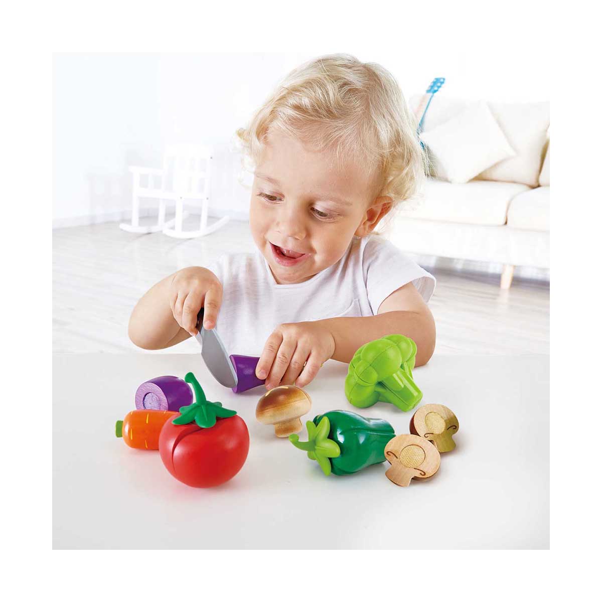 ¡No hay nada más saludable que las verduras frescas! Corta los tallos y usa el cuchillo para trocear el morrón verde, el tomate y muchas otras verduras. Las verduras se mantienen unidas con pestañas autoadhesivas y se separan para darles mayor realismo.