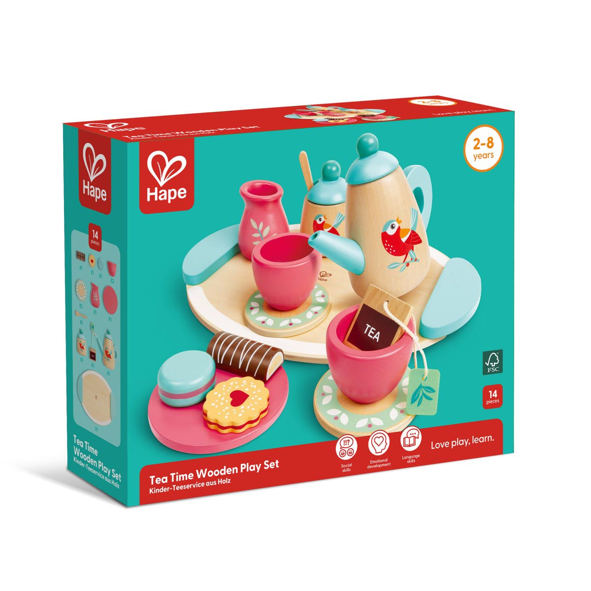 Con este elegante juego de té de madera, los chicos pueden armar su propia fiesta del té para disfrutar con sus amigos humanos o de peluche.