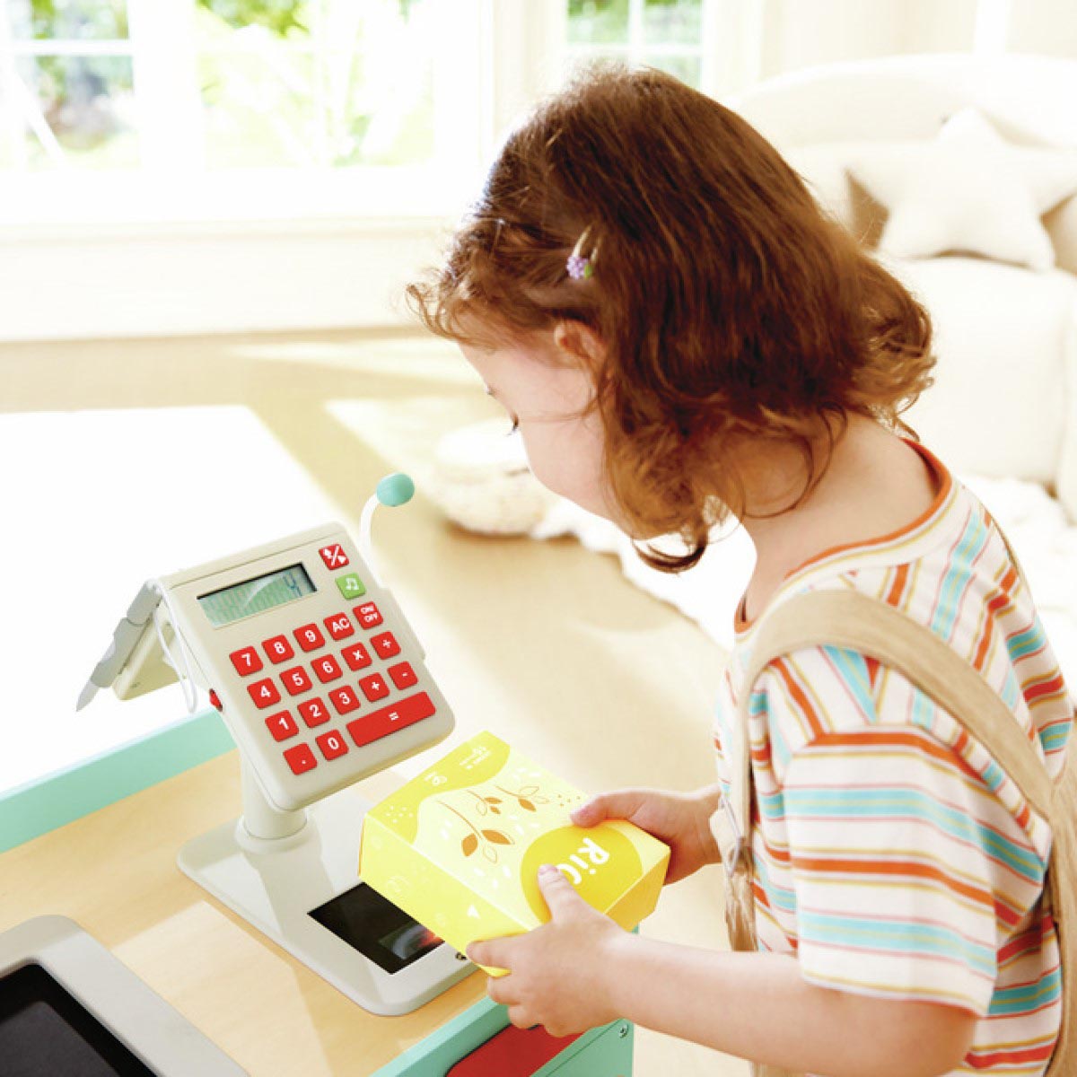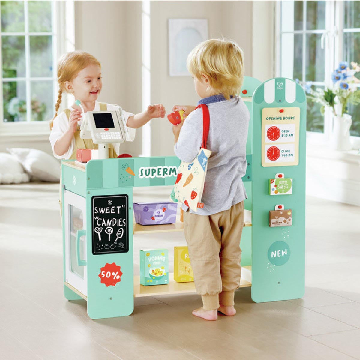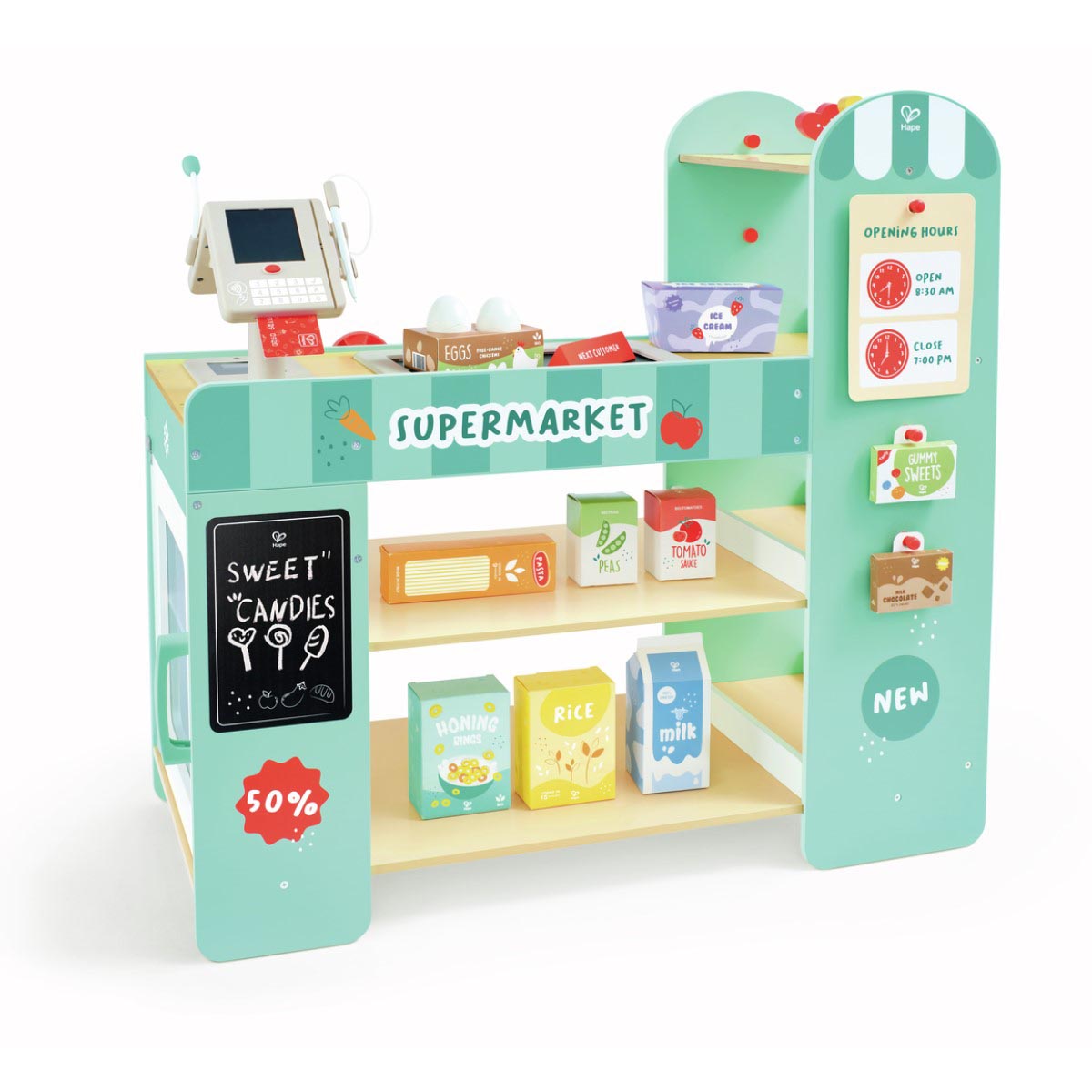 Una verdadera aventura de compras. Los chicos pueden ser cajeros, clientes o vendedores, usando la cinta transportadora manual, la caja registradora interactiva y el lector de tarjetas. Incluye accesorios, desde comestibles hasta dinero de juguete.