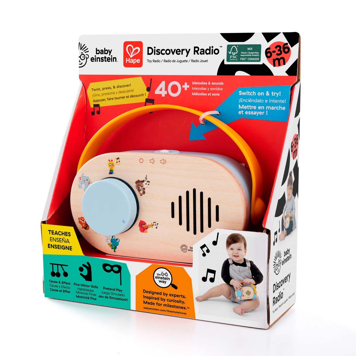 Con 6 estaciones y 12 sonidos de animales, 30 melodías y luces brillantes, esta radio clásica de juguete de madera inspirada en Montessori recompensa la curiosidad del bebé mientras gira el dial. Usa 3 pilas AAA.