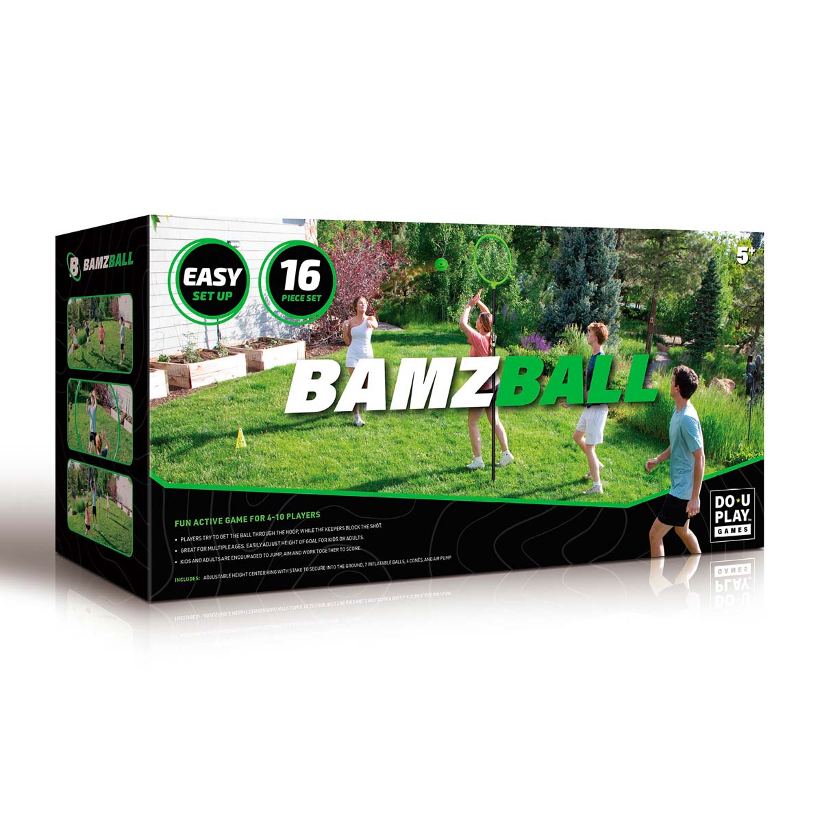 Bamzball es perfecto para la playa o el parque. Ideal para jugar entre amigos, grupos, fiestas, reuniones, escuelas y eventos al aire libre. Incluye poste de altura ajustable, aro, ancla, 2 balones inflables, 4 conos, un inflador y reglas del juego.