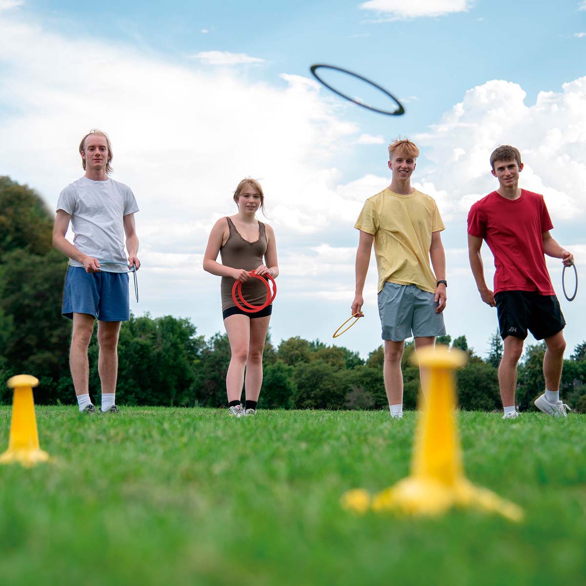 Lanzá los aros al triángulo central y conseguí más puntos que tus contrincantes en este juego de lanzamiento de aros que combina estrategia y coordinación. Incluye 3 estrellas Trigo, 4 juegos de 3 aros, bolsa, cuerda de lanzamiento y regla. Desde 3 años.
