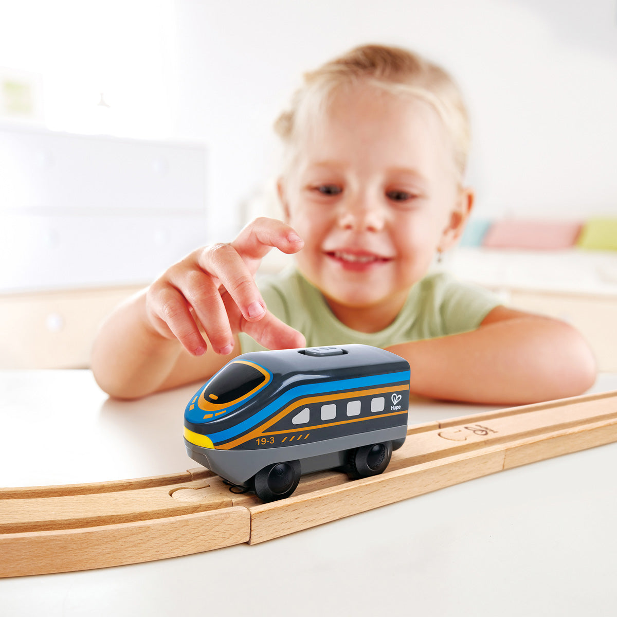Locomotora a pilas que avanza sola. Compatible con vías de madera, potencia el juego imaginativo y la coordinación. ¡Prendé el motor de la diversión!