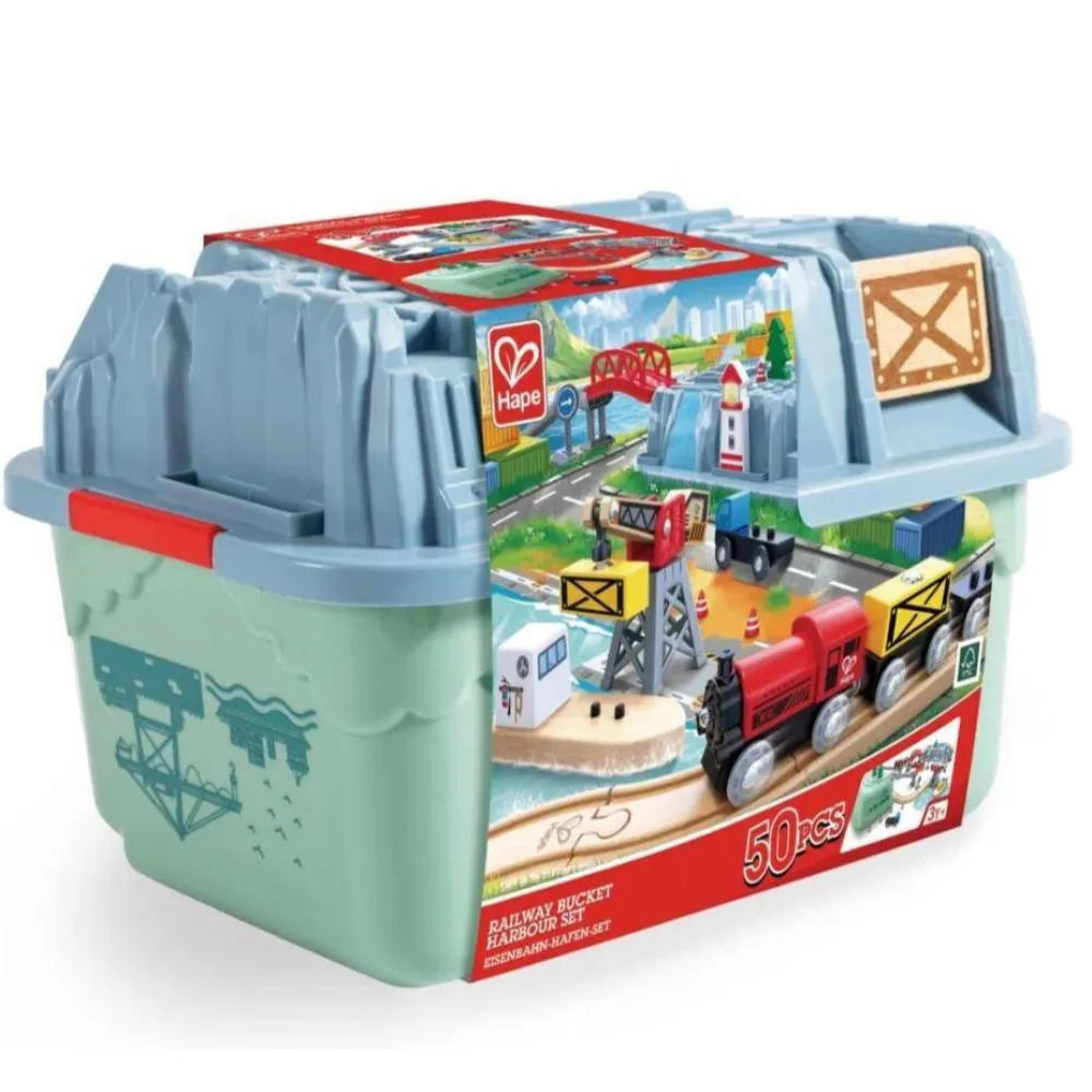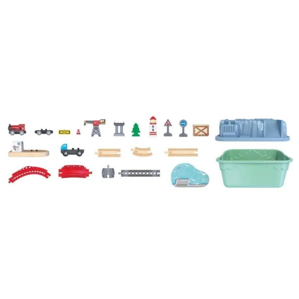 Convertí cualquier habitación en un puerto animado. Con una grúa de carga funcional, un contenedor que también forma parte de la escena, un barco de carga, vías, una locomotora, dos vagones, un camión de carga, señales de tránsito y otros accesorios.