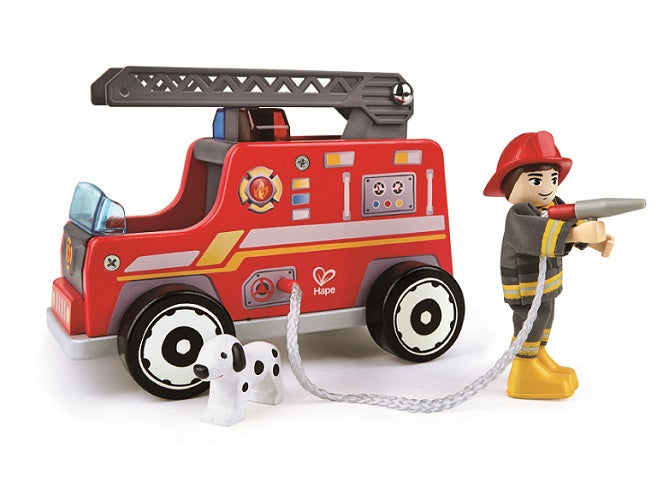 Abran paso. Este bombero tiene un fuego que apagar. Colocá la escalera ajustable del camión para que el bombero y el perro flexibles puedan enfrentar el desafío.