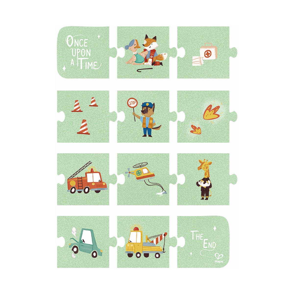 Un juego de 4 puzzles separados con diferentes piezas. Podés probar primero con el puzzle de pocas piezas y luego pasar al más grande y crear tu propia historia de rescate. También hay fichas adicionales para crear historias.